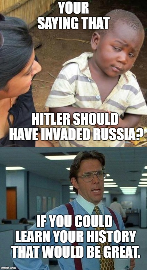 My history teacher is so bad. YOU IDIOT HE DID INVADE RUSSIA. Or the soviets, I respect all pronouns. le maîtreJanuary 15, 2019meme Post navigation PreviousNext http://bit.ly/2DaJRm1 via /r/HistoryMemes http://bit.ly/2TRx11I Share this: Share on X (Opens in new window) X Share on Facebook (Opens in new window) Facebook Like Loading... Related